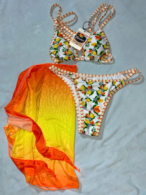 Citrus Bloom 3-Piece Bikini Set with Sheer Cover-Up